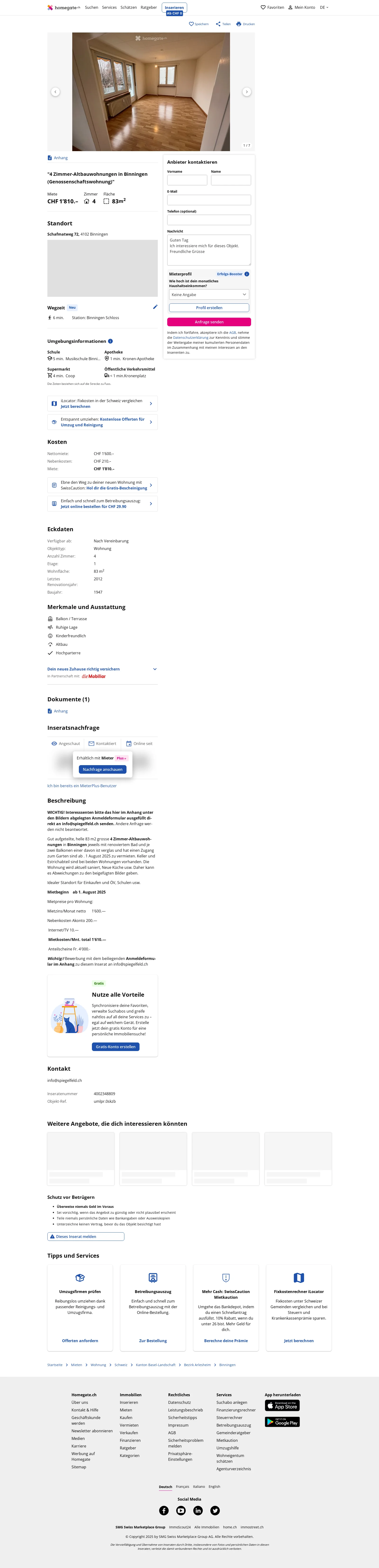 Gut aufgeteilte, helle 83 m2 grosse 4 Zimmer-Altbauwohnungen in Binningen jeweils mit renoviertem Bad und je zwei Balkonen einer davon ist verglas und hat einen Zugang zum Garten sind ab . 1 August 2025 zu vermieten. Keller und Estrichabteil sind bei beiden Wohnungen vorhanden. Die Wohnung wird aktuell saniert, Neue Küche usw. Daher kann es Abweichungen zu den beigefügten Bilder geben.