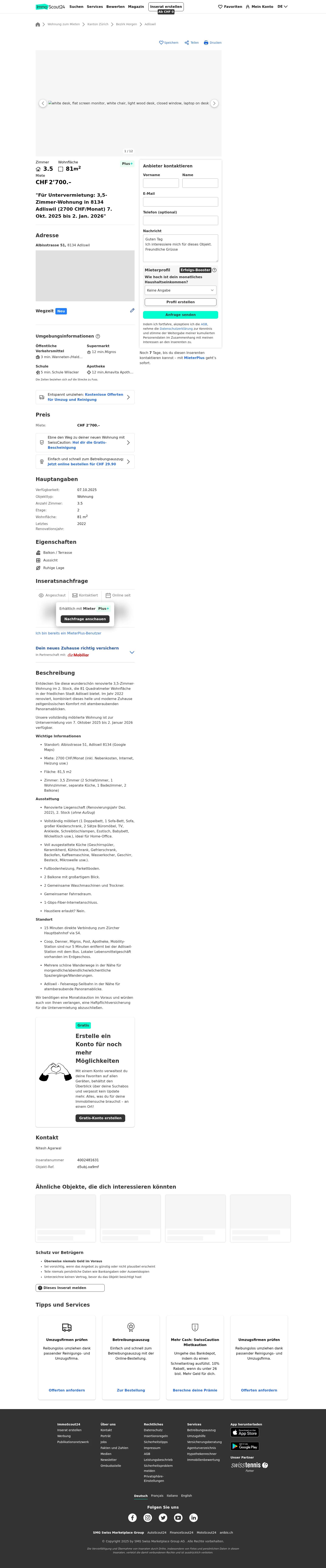 Miete: 2700 CHF/Monat (inkl. Nebenkosten, Internet, Heizung usw.)