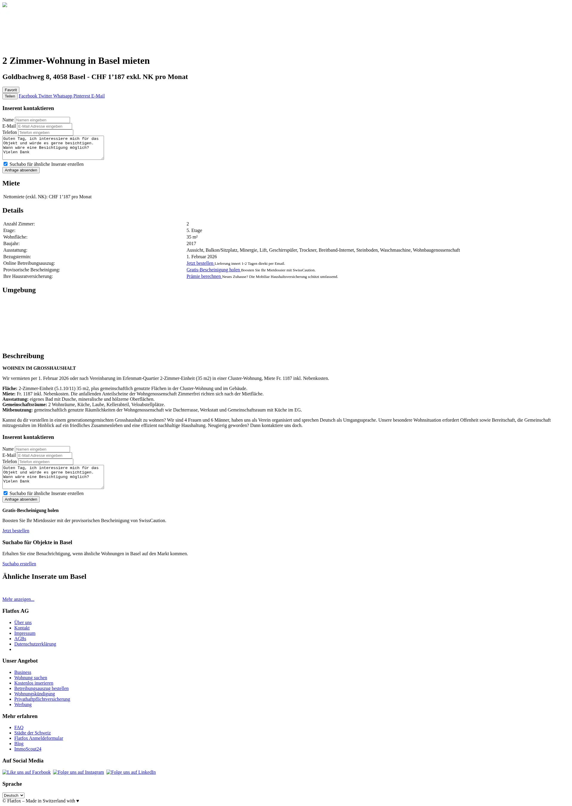 Wir vermieten per 1. Februar 2026 oder nach Vereinbarung im Erlenmatt-Quartier 2-Zimmer-Einheit (35 m2) in einer Cluster-Wohnung, Miete Fr. 1187 inkl. Nebenkosten.
