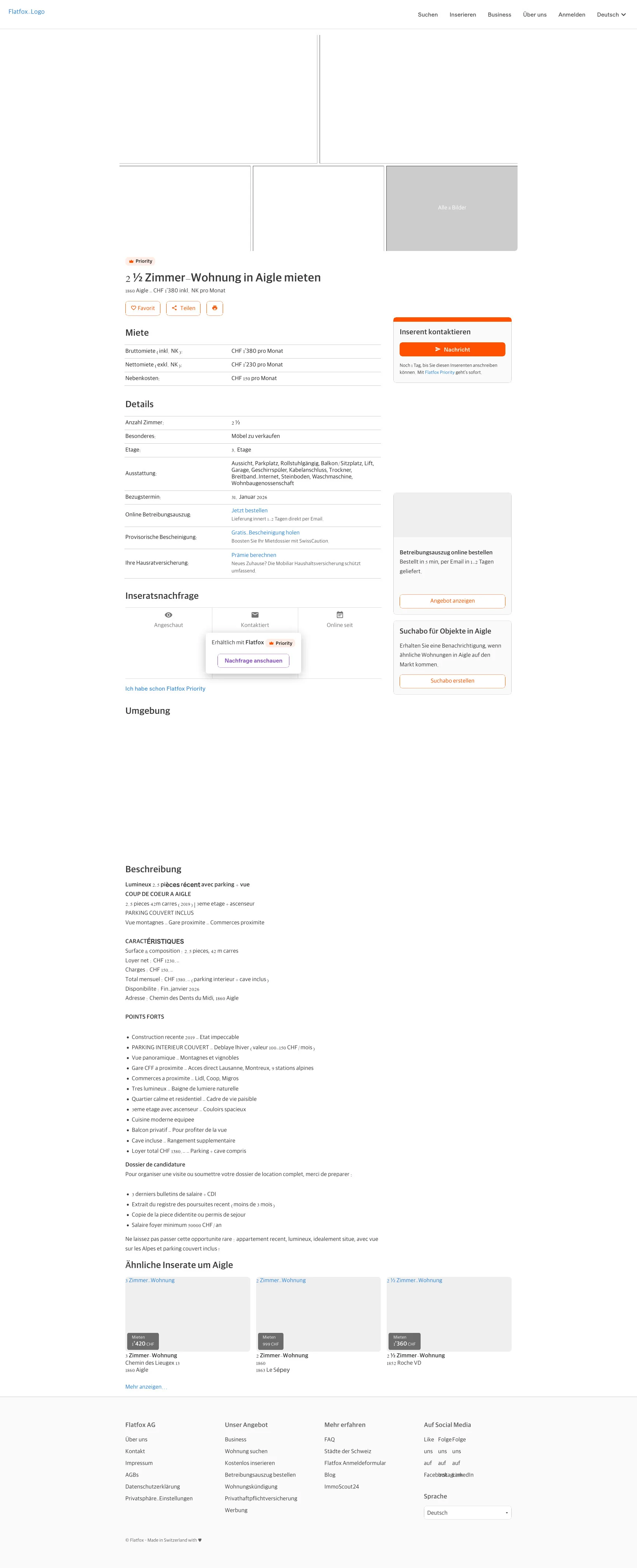 Total mensuel : CHF 1'380.- (parking interieur + cave inclus)