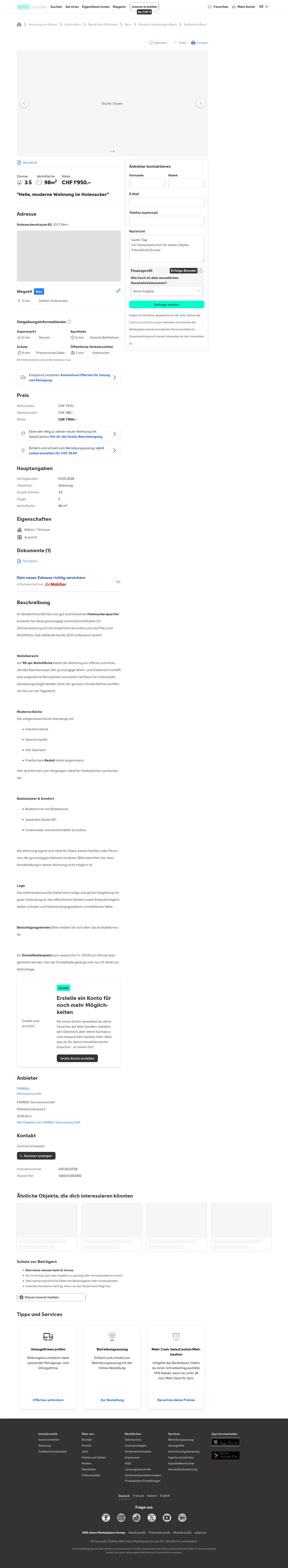 Diese 3.5-Zimmerwohnung in Bern, 3027 bietet 98 m² Wohnfläche. Miete: CHF 1'950/Monat