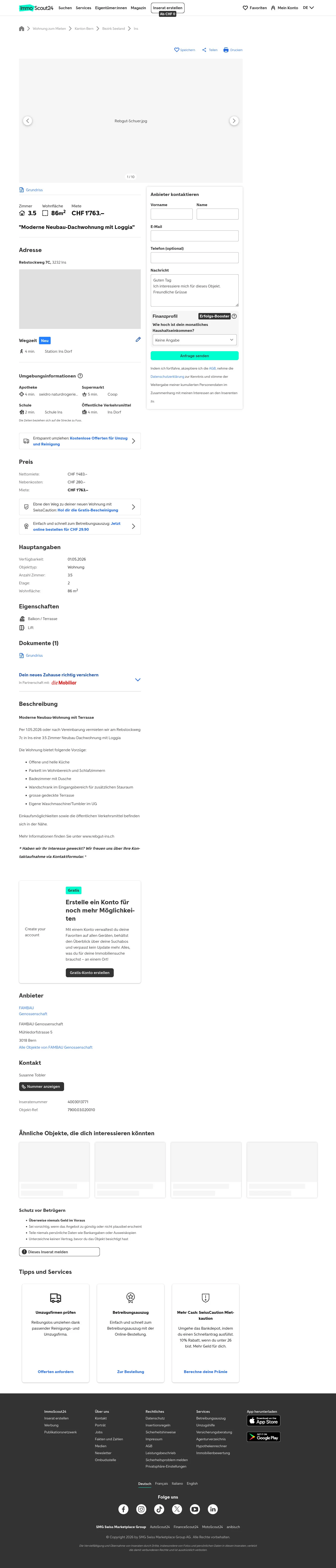 Diese 3.5-Zimmer-Wohnung in Ins (3232) bietet 86 m² Wohnfläche. Die Neubau-Dachwohnung am Rebstockweg 7c verfügt über eine Loggia und ist per 01.05.2026 (oder nach Vereinbarung) verfügbar.