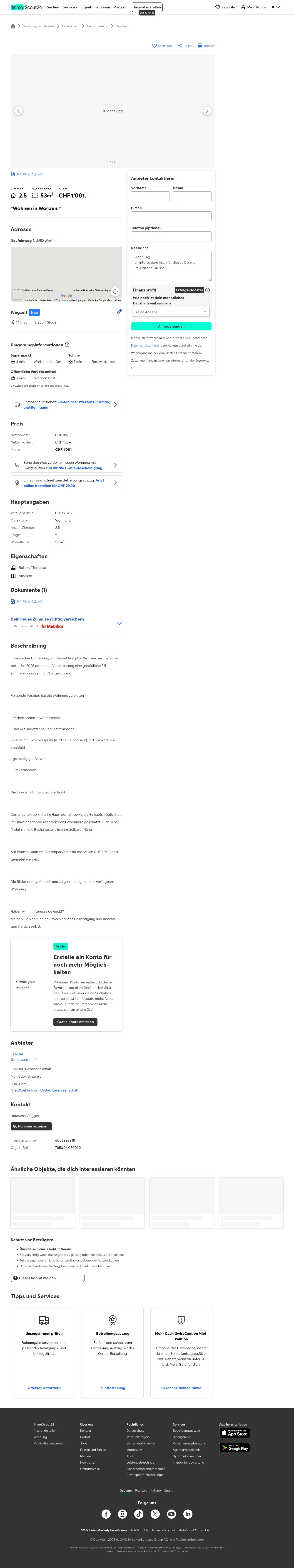 Diese 2.5-Zimmerwohnung in Worben (3252) am Neufeldweg 4 liegt im 5. Obergeschoss und bietet 53 m² Wohnfläche. Verfügbar ab 1. Juli 2026 (oder nach Vereinbarung). Die Genossenschaft ist FAMBAU Genossenschaft.