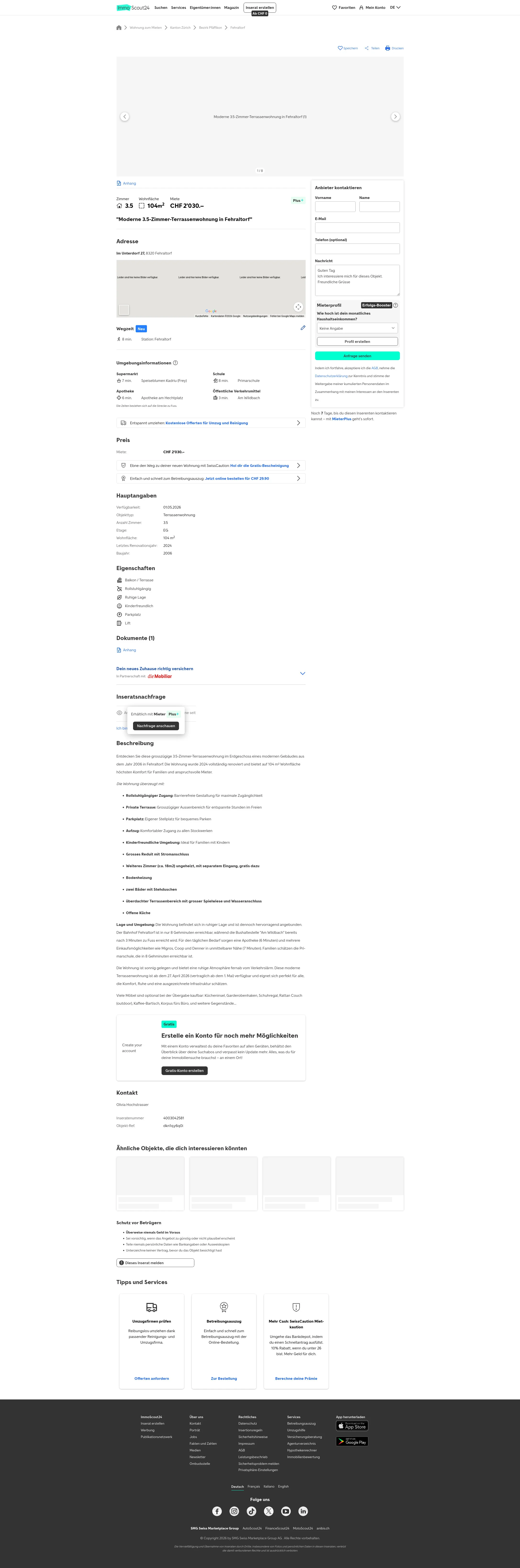 Diese 3.5‑Zimmer‑Terrassenwohnung in Fehraltorf (8320) bietet 104 m² Wohnfläche. Die Wohnung im Erdgeschoss befindet sich in einem Gebäude aus dem Jahr 2006 und wurde 2024 vollständig renoviert.
