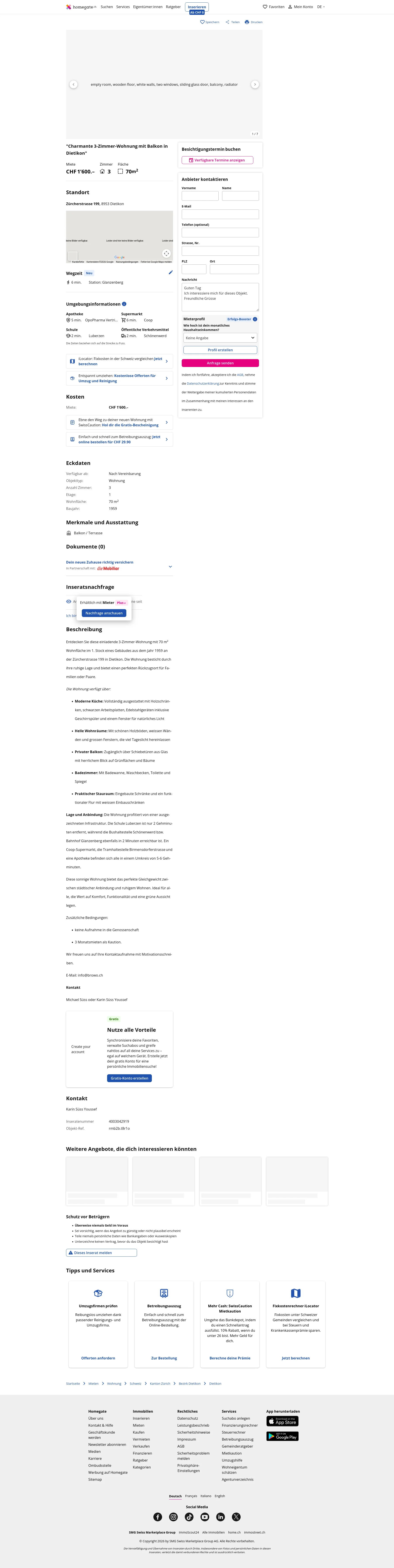 Diese 3-Zimmer-Wohnung in Dietikon (8953) bietet 70 m² Wohnfläche im 1. Stock eines Gebäudes aus dem Jahr 1959 an der Zürcherstrasse 199. Miete: CHF 1600/Monat. Genossenschaft: Browo-Genossenschaft.