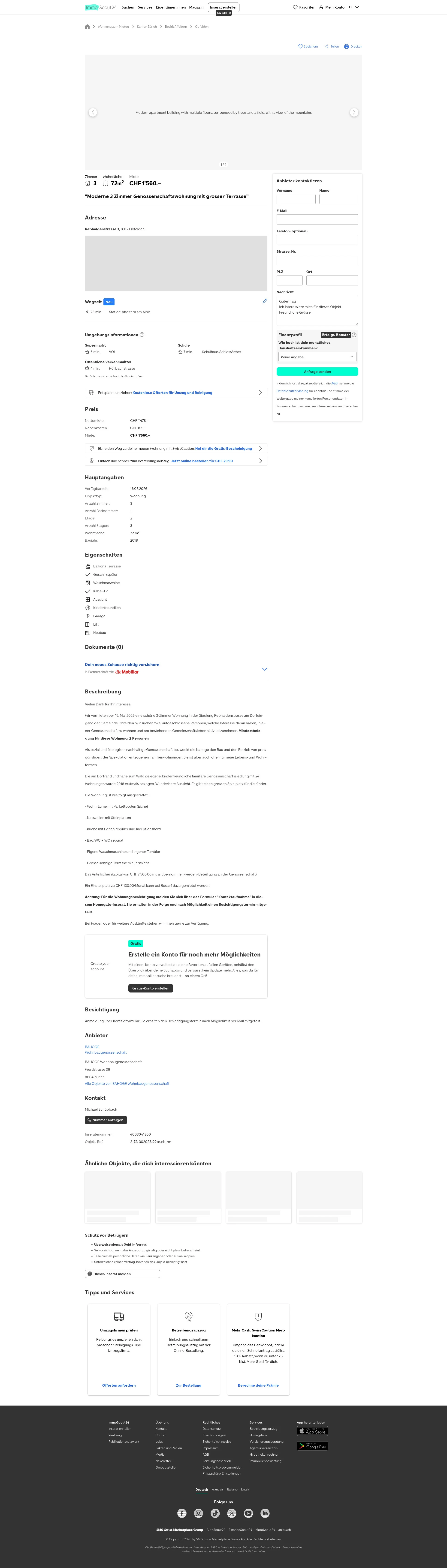 Diese 3.0-Zimmer-Wohnung in Obfelden (8912), in der Siedlung Rebhaldenstrasse am Dorfeingang gelegen, bietet 72 m² Wohnfläche und ist ab dem 16. Mai 2026 verfügbar.