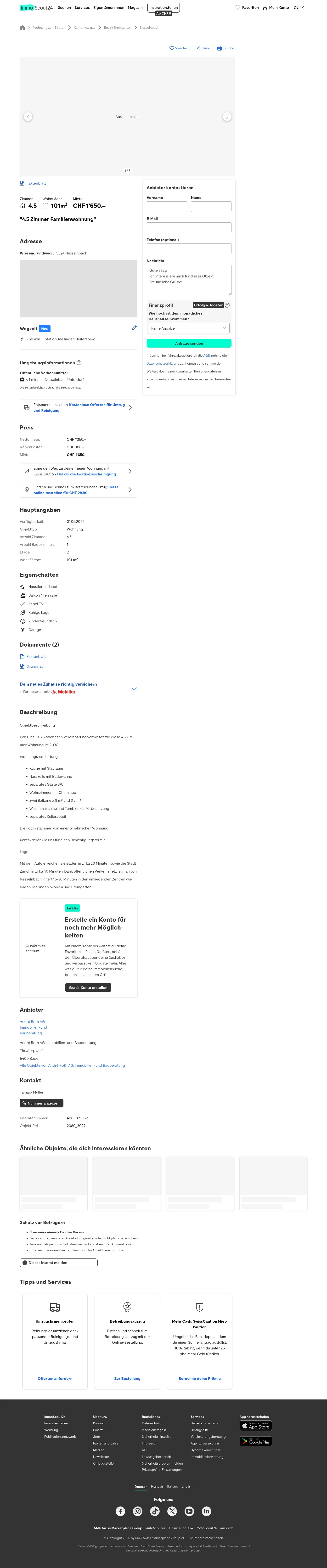 Diese 4.5-Zimmer-Wohnung in Nesselnbach (5524) bietet 101 m² Wohnfläche und befindet sich im 2. Obergeschoss. Die Wohnung ist per 1. Mai 2026 oder nach Vereinbarung verfügbar. Die Genossenschaft ist Logis Suisse AG.