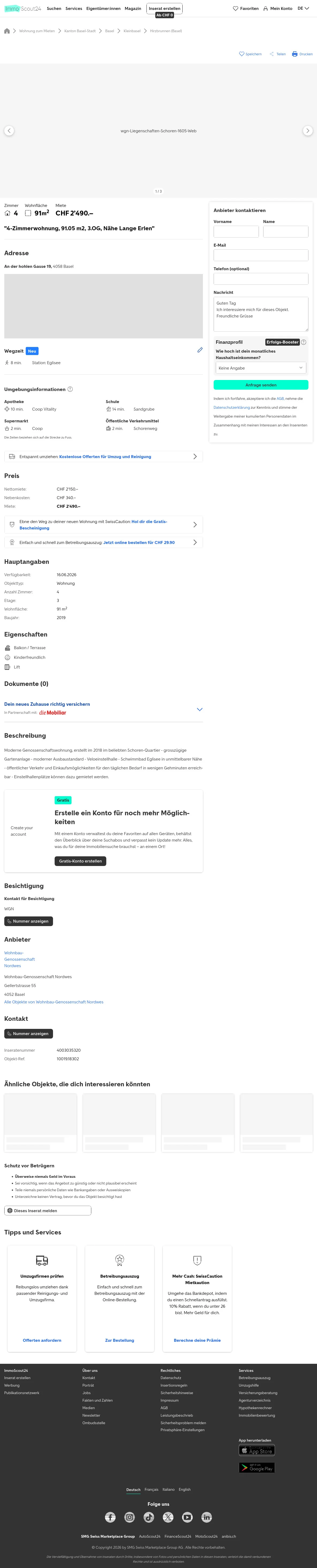 Diese 4.0-Zimmer-Wohnung in Basel (4058) bietet 91 m² Wohnfläche. Das Gebäude wurde im 2018 im Schoren-Quartier erstellt.