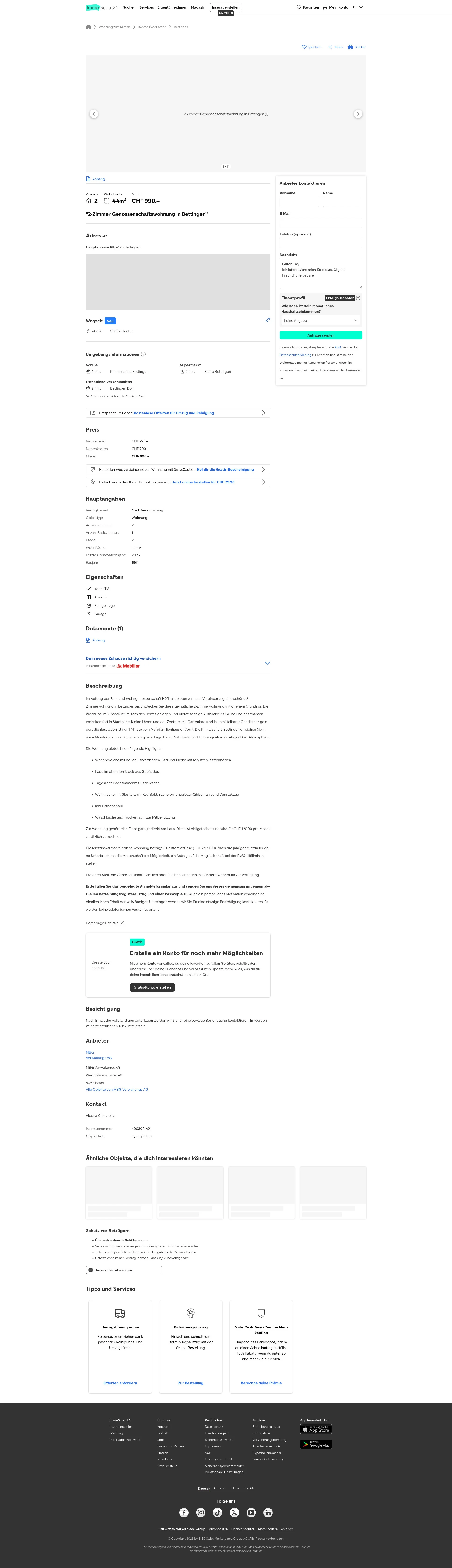 Diese 2.0-Zimmerwohnung in Bettingen (4126) bietet 44 m² Wohnfläche. Die Nettomiete beträgt CHF 990/Monat.