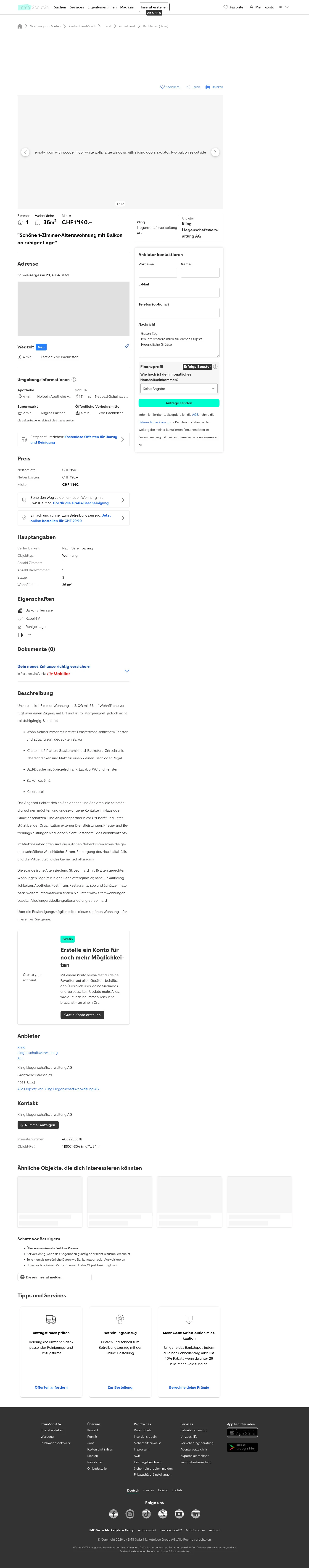 Die helle 1-Zimmer-Wohnung in Basel (4054) im 3. Obergeschoss bietet 36 m² Wohnfläche und wird von der Genossenschaft Alterswohnungen geführt. Die Wohnung ist mit Lift erreichbar und rollatorgeeignet, jedoch nicht rollstuhlgängig. Miete: CHF 1'140/Monat