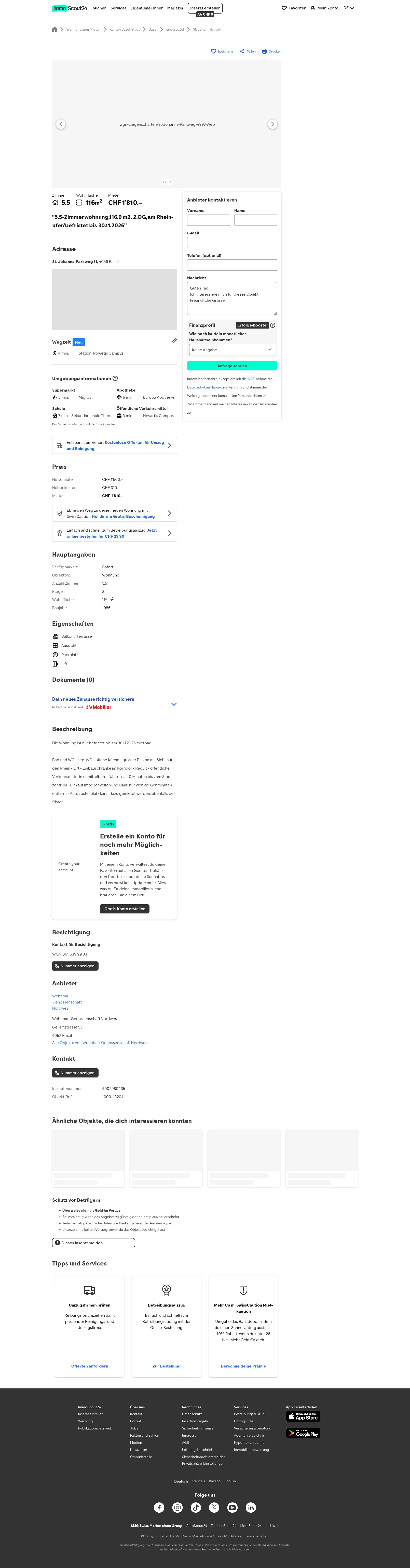 Diese 5.5-Zimmer-Wohnung in Basel (4056) bietet 116 m² Wohnfläche. Die Miete ist befristet bis 30. November 2026. Miete: CHF 1810/Monat.