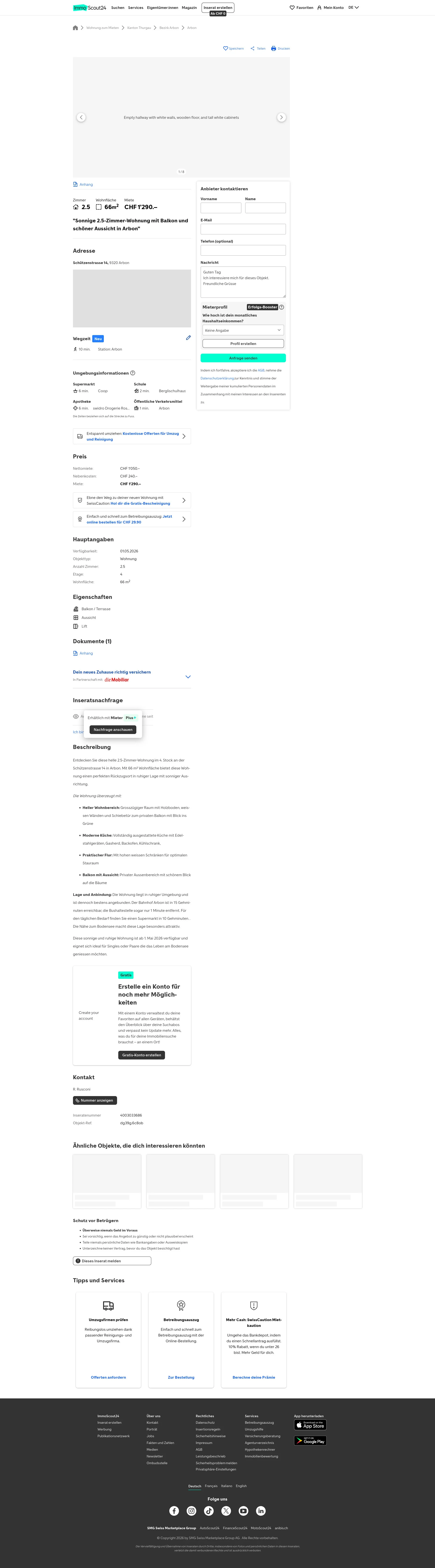 Diese 2.5-Zimmer-Wohnung an der Schützenstrasse 14, 9320 Arbon bietet 66 m² Wohnfläche im 4. Stock. Mietzins: CHF 1'290/Monat