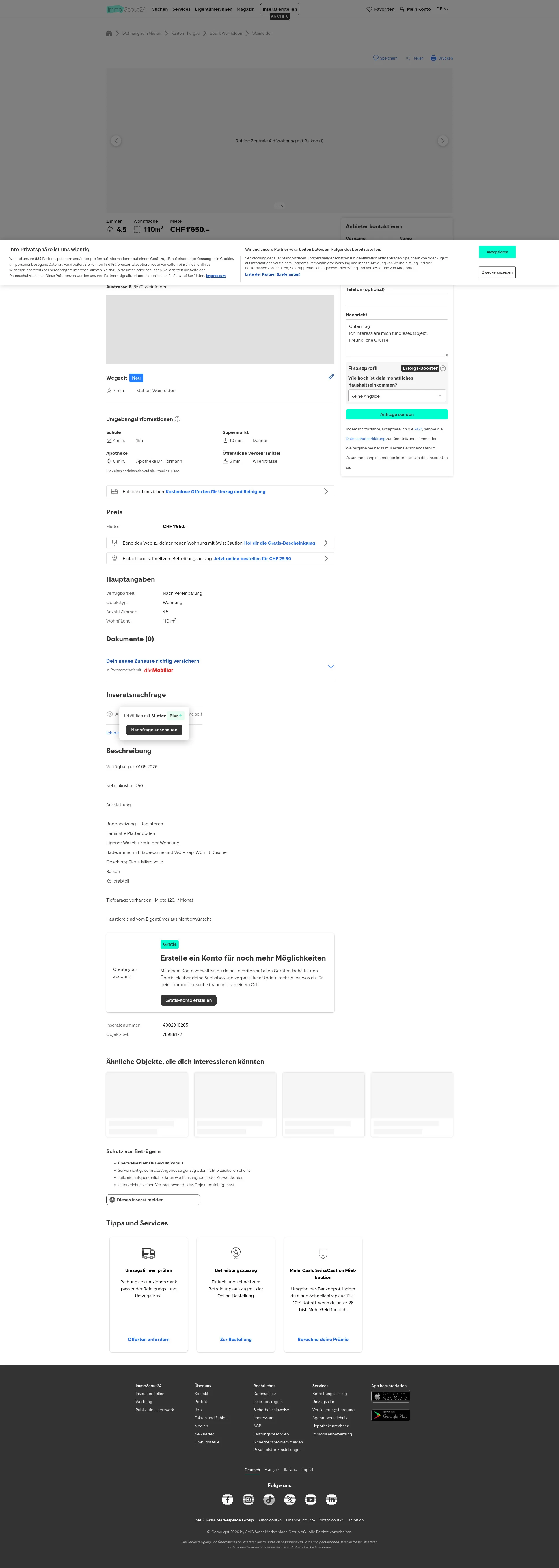 Diese 4.5-Zimmer-Wohnung in Weinfelden (8570) gehört zur Wohnbaugenossenschaft Au und bietet 110 m² Wohnfläche.