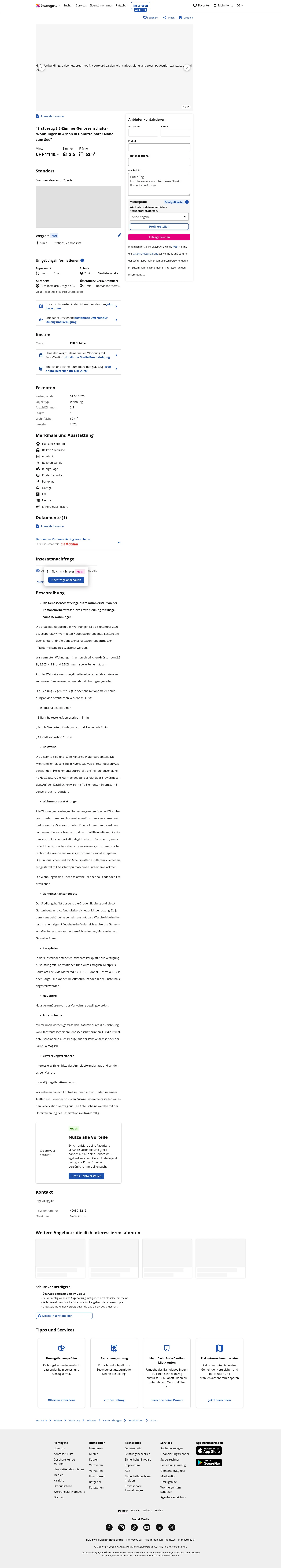 Die Wohnung gehört zur ersten Siedlung der Genossenschaft Ziegelhütte Arbon an der Romanshornerstrasse. Die gesamte Siedlung umfasst 75 Wohnungen; die erste Bauetappe mit 45 Wohnungen ist ab September 2026 bezugsbereit. Es werden Neubau-Genossenschaftswohnungen zu kostengünstigen Mieten angeboten. Für die Genossenschaftswohnungen müssen Pflichtanteilscheine gezeichnet werden.