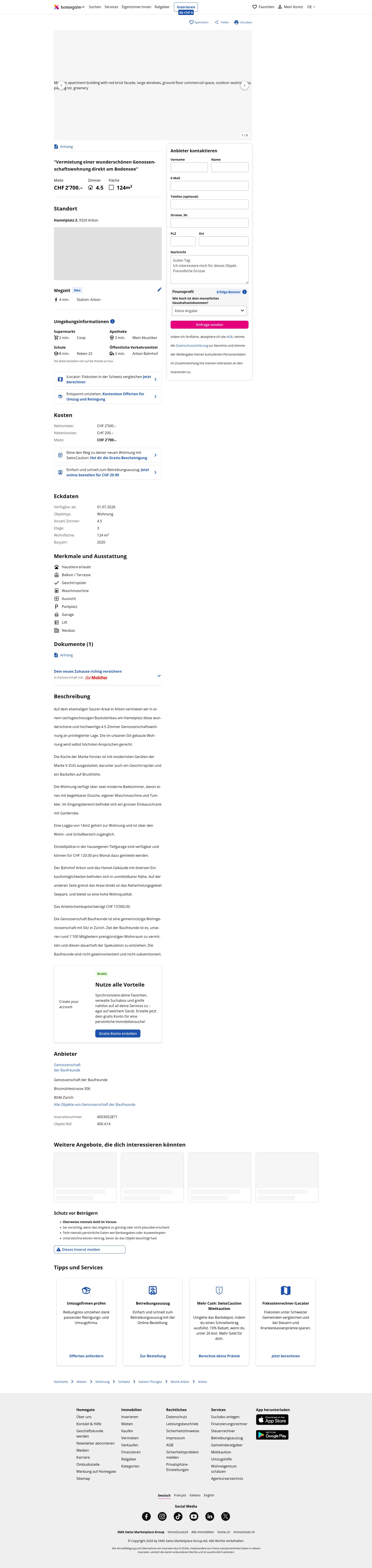 Diese 4.5-Zimmer-Wohnung in Arbon (9320) bietet 124 m² Wohnfläche und befindet sich in einem sechsgeschossigen Backsteinbau am Hamelplatz auf dem ehemaligen Saurer-Areal. Die Wohnung ist im urbanen Stil ausgeführt und wird als hochwertig beschrieben.
