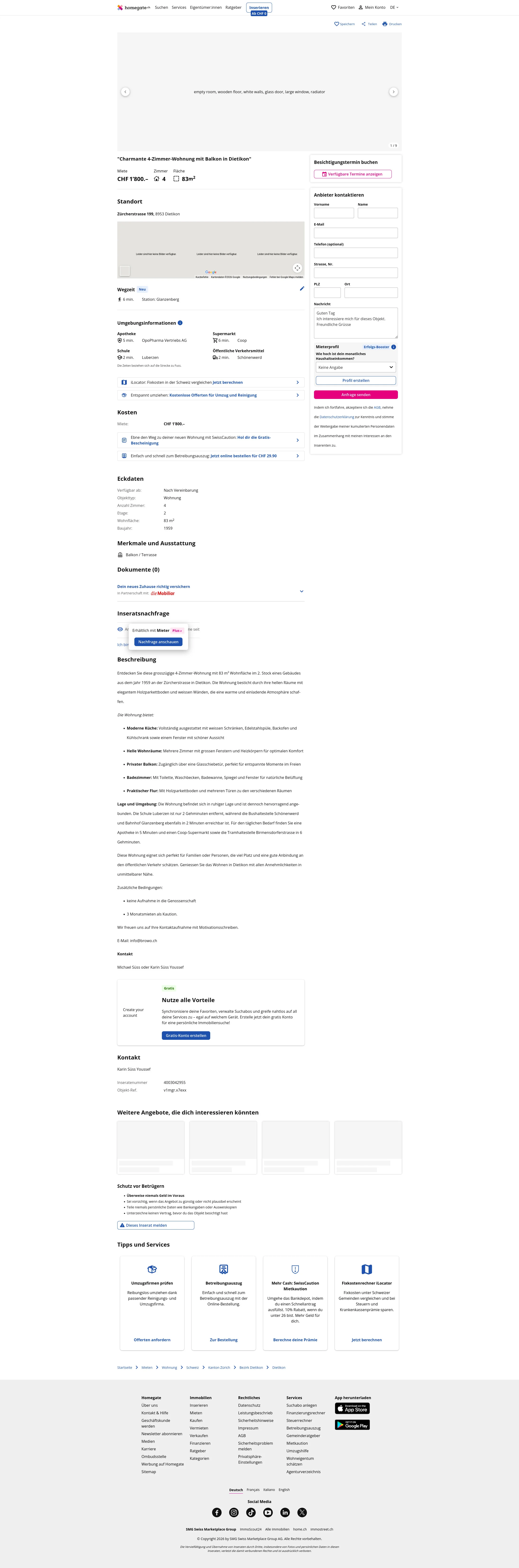 This 4.0-room apartment in Dietikon (8953) offers 83 m² of living space and is located on the 2nd floor of a building erected in 1959 on Zürcherstrasse. The cooperative is Browo-Genossenschaft.
